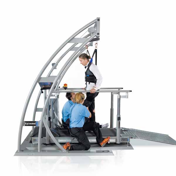 Early start of therapy with the h/p/cosmos locomotion treadmill system with body weight support. h/p/cosmos has equipped the system with an ergonomic wheelchair ramp. Furthermore the handrails contain telescopic extensions which can be pulled out 55 cm (21.65“) to give additional support to the patients. They can assist and hold the handrails in many cases even during entering the treadmill on the ramp. And most patients are happy to help if we give them such tools. |