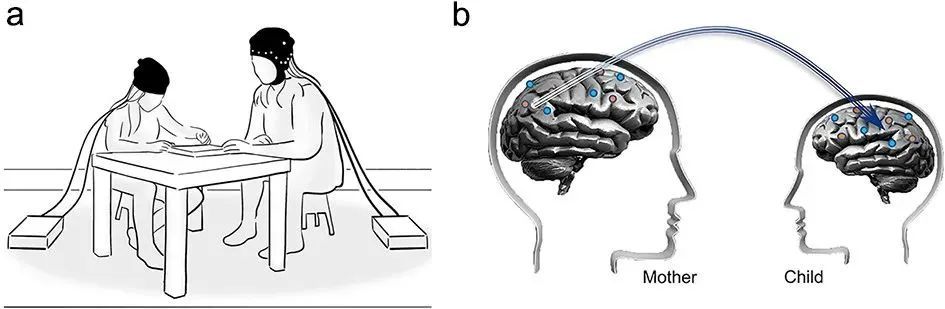 圖2 實驗設置和主要結果。a. 兒童和母親/非母親用塑料畫板共同完成一個繪畫任務(畫房子/帆船),時長為7分鐘。b. 結果發現母子左側顳頂聯合區的大腦活動同步與孩子的約束性順從行為比例顯著相關。