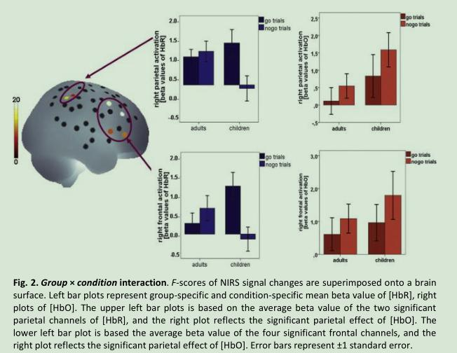 另外一項例子是關于反應抑制能力的,即廣泛使用的 GO/NOGO 范式所進行的測量,反應抑制,是執行功能的一個重要成份,對做出正確行為的決策,以適應任務變化的要求有重要作用,其功能發展于兒童早期。行為數據表明,到 3 歲時,孩子已經基本掌握評估響應抑制任務的要求,但要直到 7 歲左右才能表現出能力提高。但是,在這發育過程中改變的神經機制尚不清楚。在本研究中,研究者通過在近紅外(fNIRS)腦成像過程中應用“GO/NOGO”范式,測量了 4 至 6 歲兒童的腦激活模式和行為表現。我們發現與成人相比,兒童與抑制相關的右側額頂--前額葉激活減少。相反,運動相關的激活在年齡組之間沒有差異。我們的研究結果表明,在 4-6 歲年齡的兒童中,額頂腦成熟在抑制反應的認知發展中起著至關重要的作用。3