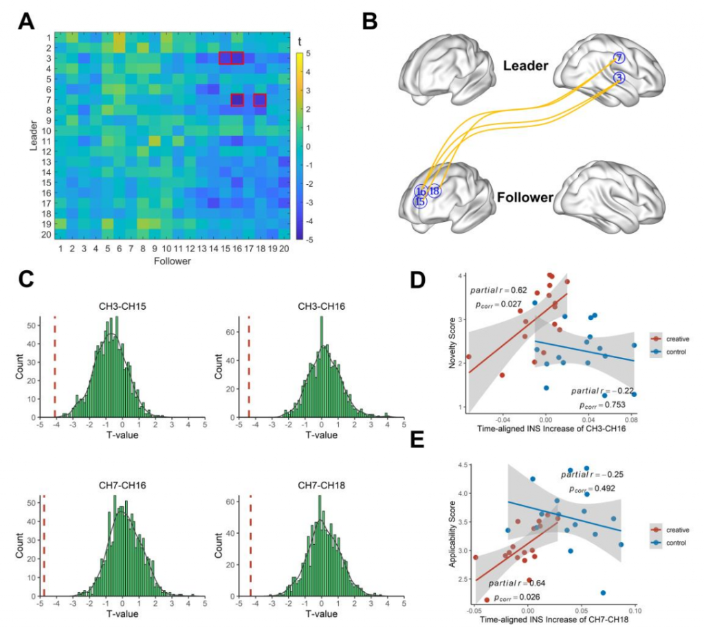 該研究發(fā)現(xiàn)在團(tuán)體創(chuàng)造過程中,個(gè)體在行為與神經(jīng)活動(dòng)上均表現(xiàn)出了領(lǐng)導(dǎo)者-追隨者角色分化的現(xiàn)象。且相比于一般任務(wù),在團(tuán)體創(chuàng)造中領(lǐng)導(dǎo)者右側(cè)顳頂聯(lián)合區(qū)(rTPJ)與追隨者左側(cè)背外側(cè)前額葉(lDLPFC)的人際神經(jīng)活動(dòng)耦合較差,這可能與成員在創(chuàng)造活動(dòng)中難以對(duì)方案或意圖形成共同理解、表征及觀點(diǎn)沖突有關(guān)。然而,當(dāng)個(gè)體間INS增強(qiáng)時(shí),創(chuàng)造性任務(wù)的績(jī)效會(huì)得到提高,這可能意味著高績(jī)效團(tuán)隊(duì)更好地整合創(chuàng)新觀點(diǎn)并達(dá)成了共同理解、意圖和目標(biāo)。此外,不同腦區(qū)的INS動(dòng)態(tài)存在差異,與團(tuán)體創(chuàng)造新穎性有關(guān)的INS在任務(wù)早期階段下降,而與適用性有關(guān)的INS在任務(wù)中期階段下降,這可能與創(chuàng)造過程特點(diǎn)有關(guān)。該發(fā)現(xiàn)揭示了自然交流背景下團(tuán)體創(chuàng)造的獨(dú)特人際神經(jīng)模式。