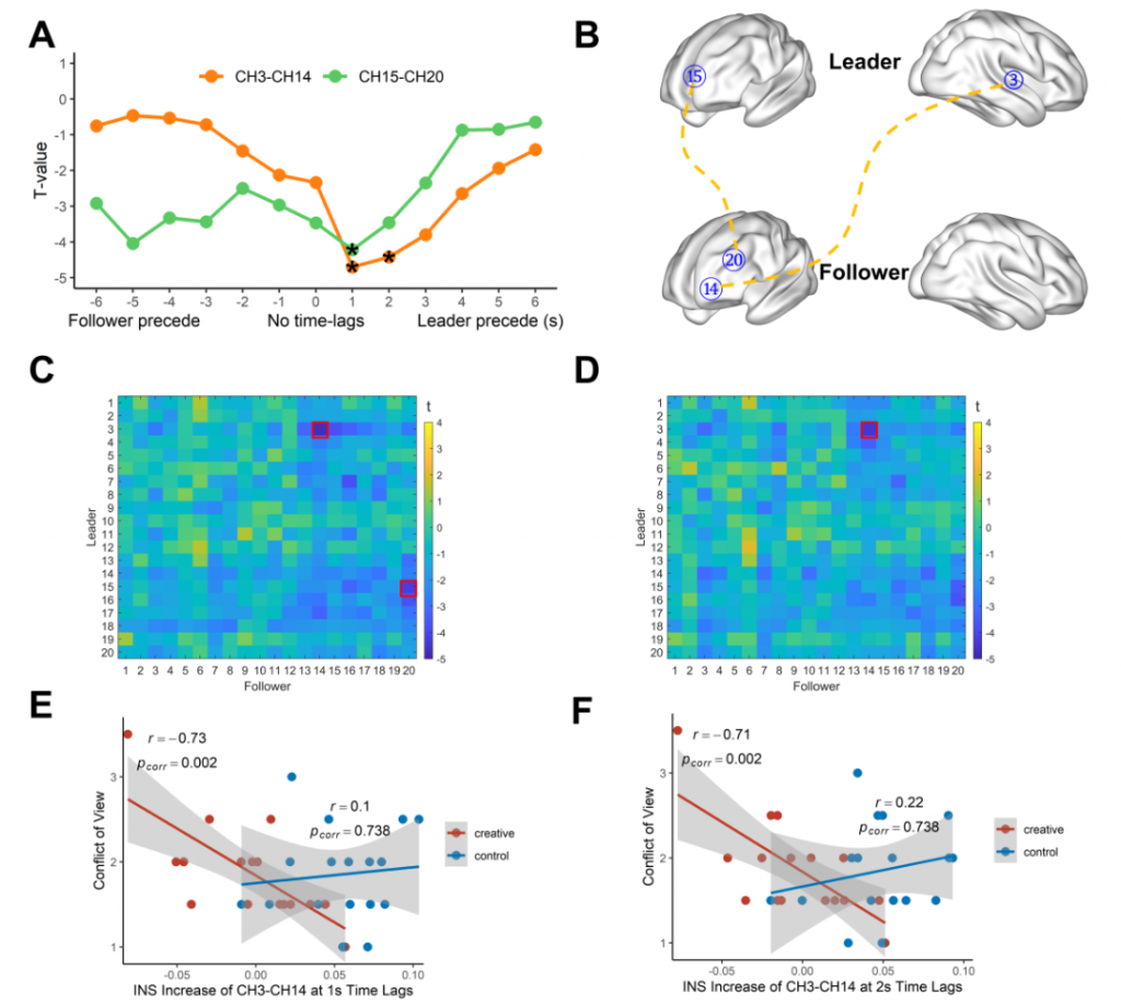 時(shí)間滯后結(jié)果發(fā)現(xiàn)相較一般條件,當(dāng)領(lǐng)導(dǎo)者的大腦活動(dòng)先于追隨者的大腦活動(dòng)1秒時(shí)創(chuàng)造性條件下CH3-CH14 (t (32) = -4.70,corrected p = 0.019, Cohen’s d =1.66) and CH15-CH20 (t (32) = -4.22, corrected p =0.038, Cohen’s d = 1.49)INS明顯更低;當(dāng)領(lǐng)先2s時(shí),CH3-CH14 (t (32) = -4.42, corrected p = 0.043, Cohen’s d = 1.56)有同樣的表現(xiàn)。另外發(fā)現(xiàn),當(dāng)領(lǐng)導(dǎo)者的大腦活動(dòng)先于追隨者的大腦活動(dòng)1秒和2秒時(shí)創(chuàng)造性條件下CH3-CH14的INS增強(qiáng)與小組內(nèi)的觀點(diǎn)沖突成負(fù)相關(guān)(1-s time lag: rCH3-CH14 = -0.73, corrected pCH3-CH14 = 0.002; 2-s time lag:rCH3-CH14 = -0.71, corrected pCH3-CH14 = 0.002)。