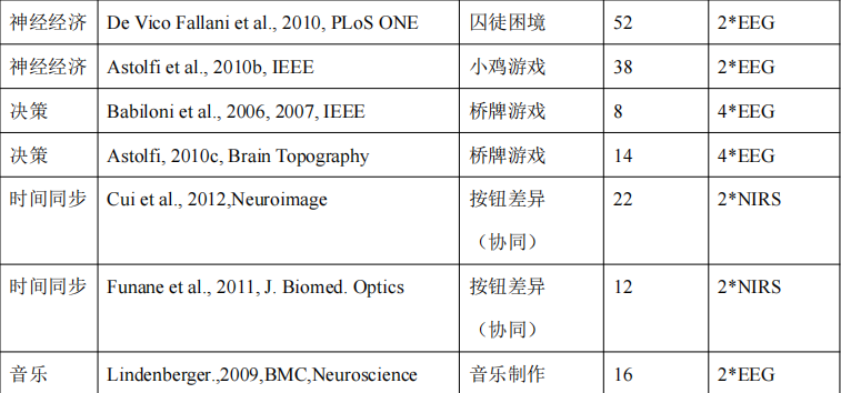 根據(jù)以往文獻(xiàn)研究,使用腦電、核磁、近紅外等進(jìn)行超掃描研究的文章如下所示: