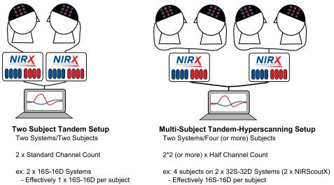 不同于腦電和核磁測(cè)量,近紅外的雙人掃描不僅可以一臺(tái)設(shè)備測(cè)量一個(gè)被試,也可以一臺(tái)設(shè)備同時(shí)測(cè)量?jī)蓚€(gè)被試。不過(guò)相比較不同的是,使用一臺(tái)近紅外設(shè)備測(cè)量?jī)蓚€(gè)及以上被試需要考慮到光源和探測(cè)器的數(shù)量,因此推薦使用高配置(多探測(cè)器和光源)近紅外設(shè)備。