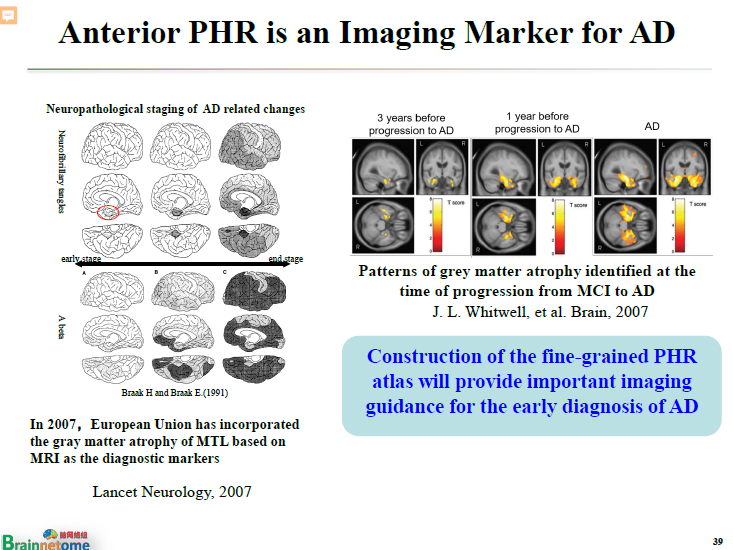 但旁海馬這個(gè)腦區(qū),包括內(nèi)側(cè)顳葉、腦皮質(zhì)的萎縮可以用于輔助診斷AD。早在2007年,歐盟的指南里就已經(jīng)提到了內(nèi)側(cè)顳葉。旁海馬實(shí)際上只是內(nèi)側(cè)顳葉的一小部分。