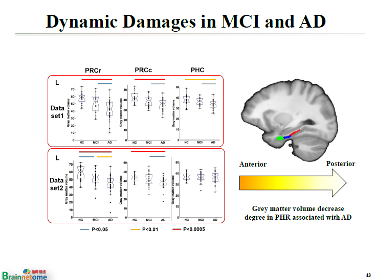 更重要的是,我們發(fā)現(xiàn)AD病人的旁海馬經(jīng)歷了前、中、后這樣一個(gè)漸變的過(guò)程。在較早的時(shí)候,可能只有最前層開(kāi)始萎縮,慢慢地往中間的過(guò)渡,等老年癡呆以后,整個(gè)旁海馬都開(kāi)始萎縮了。