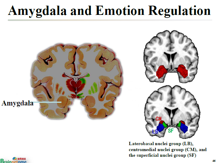 這個(gè)問(wèn)題到現(xiàn)在并沒(méi)有非常清晰的答案。但有一些腦區(qū)跟情緒調(diào)節(jié)有關(guān)是非常明確的。像Amygdala,即杏仁核腦區(qū),就是跟情緒調(diào)節(jié)有關(guān)的,而且這個(gè)結(jié)論非常明確。