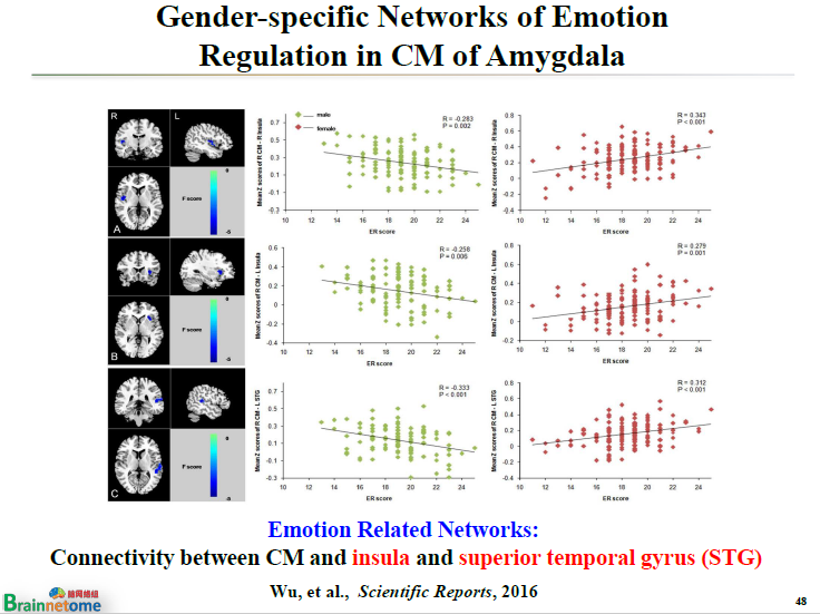 但同樣是中央內(nèi)側(cè)核,它跟島葉(insula)或顳上回(Superior temporal gyrus)這樣一些腦區(qū)的連接強(qiáng)度,跟情緒調(diào)節(jié)的分?jǐn)?shù)做相關(guān)以后,男性里面又變成了負(fù)相關(guān),女性里面則變成了正相關(guān)。