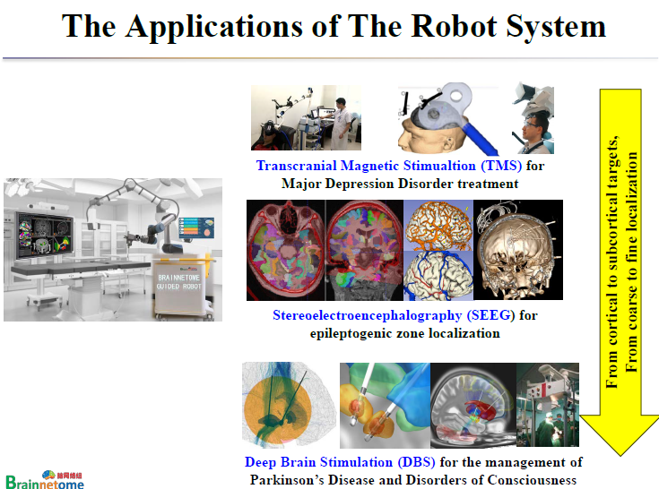所以我們希望能夠建造一個(gè)手術(shù)機(jī)器人,手術(shù)規(guī)劃好以后由機(jī)器人去放置電極。腦網(wǎng)絡(luò)組圖譜導(dǎo)航的手術(shù)機(jī)器人(Brain netome Atlas Guided Neurosurgical Robot)。第一款機(jī)器人馬上就要出來(lái)了。