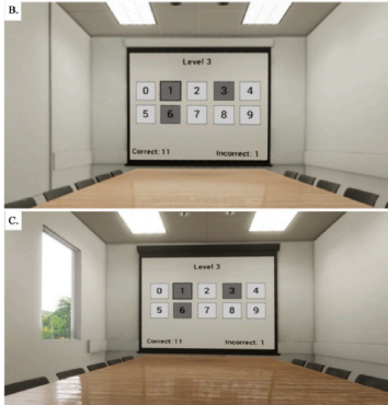 教室一共有四種設(shè)計(jì)方式。第一種設(shè)計(jì)是構(gòu)建了一個(gè)沒(méi)有窗戶(hù)的真實(shí)大學(xué)教室的虛擬現(xiàn)實(shí)渲染圖,即“中性”條件;第二種設(shè)計(jì)在房間左邊的墻上增加一扇窗戶(hù),可以看到部分晴朗的天空和樹(shù)梢,即“單窗”條件;第三種設(shè)計(jì)是在教室的房頂上面增加兩扇窗戶(hù),但是沒(méi)有側(cè)窗,即“雙窗”條件;第四種設(shè)計(jì)是將房間的寬度由15英尺增加到22英尺,即“加寬”條件。