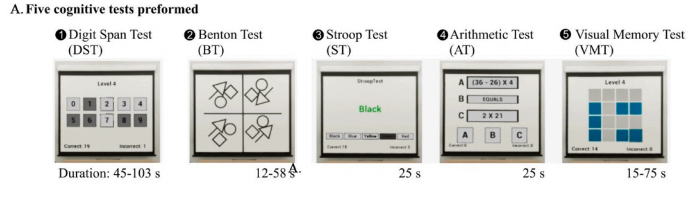 在四種教室設(shè)計(jì)條件下,參與者分別進(jìn)行五次認(rèn)知測(cè)試(如圖3):數(shù)字廣度測(cè)試(DST),Benton測(cè)試(BT),Stroop測(cè)試(ST),以及算術(shù)測(cè)試(AT)和視覺(jué)記憶測(cè)試(VMT)。