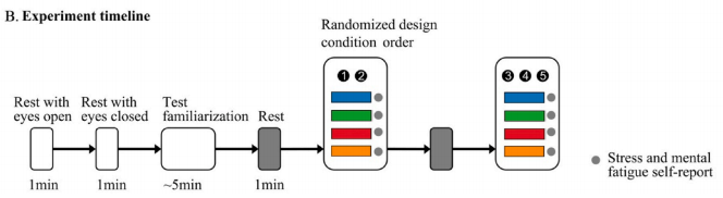 本研究一共招募23名參與者,其中有8名女性,15名男性(M = 26.17, SD = 10.4)。所有參與者都來(lái)自休斯頓大學(xué),分別代表工程、生物科學(xué)、設(shè)計(jì)、人文、經(jīng)濟(jì)和計(jì)算機(jī)科學(xué)等院系。參與者具有不同的國(guó)家和種族背景。所有參與者的視力或矯正視力均正常,且所有參與者疲勞程度都比較低。