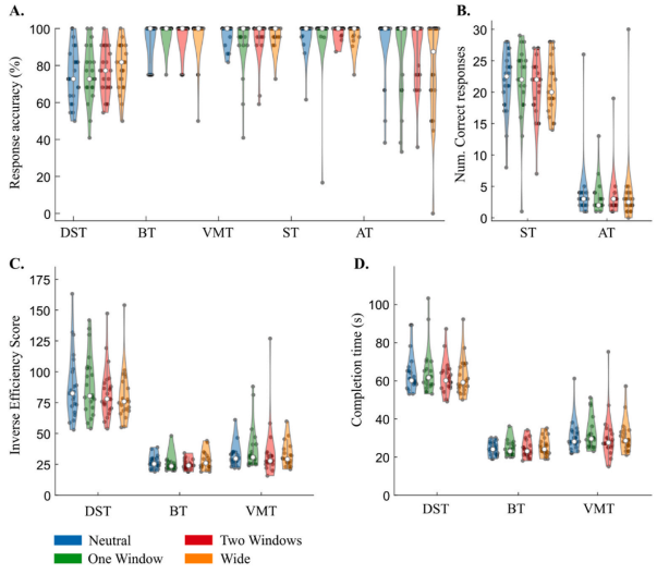 行為測(cè)試的結(jié)果表明,在不同的教室設(shè)計(jì)條件(單窗、雙窗、加寬)下認(rèn)知測(cè)試的結(jié)果沒(méi)有顯著差異。在虛擬教室環(huán)境中,教室設(shè)計(jì)的變化并沒(méi)有改善參與者在認(rèn)知測(cè)試上的表現(xiàn)。這可能是由于參與者在實(shí)驗(yàn)前有大量的時(shí)間練習(xí)測(cè)試任務(wù),導(dǎo)致天花板效應(yīng)的出現(xiàn)。