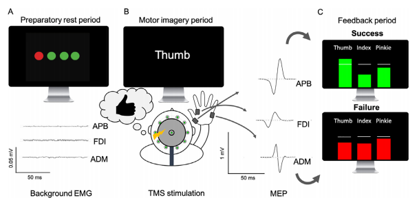 因此,本研究提出了一種通過NF支持單指運動MI的替代方法,并提出了一種新的方案,即使用經顱磁刺激(TMS)來檢測初級運動皮層(M1)中MI誘導的運動模式。