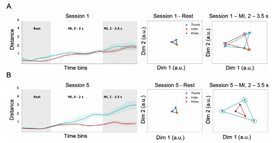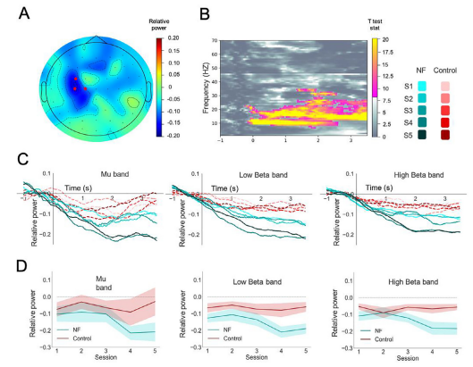 研究發現,有信息反饋的TMS-NF訓練,能夠使參與者有選擇地激活一個手指的皮層運動興奮性,同時抑制同一只手其他手指的興奮性,這是單獨使用MI訓練無法完成的。腦電圖的測量結果表明,采用運動想象的方式針對性地實現某個手指的興奮,將會伴隨著大腦感覺運動節律強烈的去同步化,尤其是在β頻段。此外,與未提供神經反饋的對照組相比,有信息反饋的TMS-NF組促進了更具有區分度的單個手指的腦電激活模式產生。