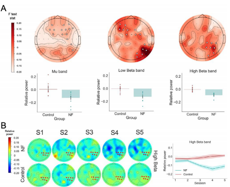 在頂枕電極簇,高β頻段ERD隨著訓練逐漸增加,但僅在NF組中增加,而對照組幾乎沒有增加。這些結果表明,TMS-NF可能影響了與感覺運動處理相關的高級區域的活動。