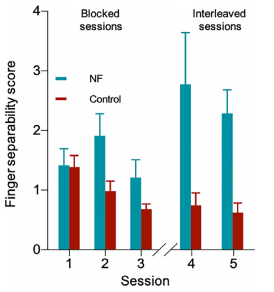表征相似性分析(RSA)是一種多變量方法,可用于推斷不同MI任務是否由特定的神經活動模式表示。分析結果發現,手指區分度評分在準備休息期間比較小,但在開始MI后逐漸增加,表明在拇指、食指和小指進行MI時,EEG激活模式差異越來越大(圖5)。與對照組相比,NF組的手指可分離程度顯著增加(圖6;組 x session 交互X2(4,10)=17.55, p = 0.001)。