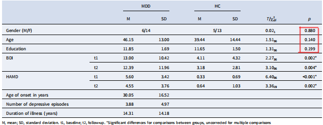 表1 重度抑郁癥患者(MDD)和健康對照組(HC)的人口統(tǒng)計學(xué)和臨床評分