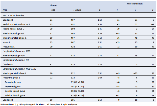 在基線時,與HC組相比,MDD患者右側(cè)尾狀核的fALFF值更大,左側(cè)內(nèi)側(cè)OFC、左側(cè)MFG、左側(cè)IFG、左側(cè)IPL、左島葉和左楔前葉的fALFF值更低。重度抑郁癥中,左內(nèi)側(cè)OFC與認(rèn)知,特別是學(xué)習(xí)和記憶有關(guān)。MFG的內(nèi)在活動與學(xué)習(xí)和記憶有關(guān),這表明MFG基線活動的紊亂與MDD患者的認(rèn)知功能有關(guān)。