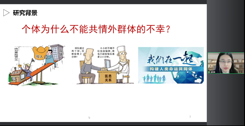 大家好,我是周雨青。今天晚上我報告的主題是《共情的內群體偏向:機制與改變》。我過去的研究主要是想回答這樣一個科學問題,個體為什么不能共情外群體的不幸?