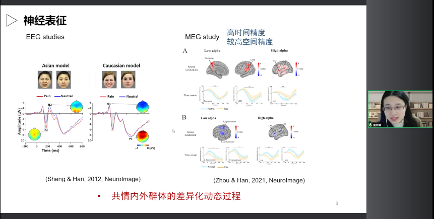 而我們近期運用腦磁圖,利用其高時間精度以及較高的空間精度,去嘗試刻畫我們共情內外群體時的動態過程。我們發現對于內群體的共情主要是涉及和認知以及情感有關的腦區,而與外群體的共情主要是涉及一些前腦島以及感覺成分,并且認知與感覺成分的活動要早于情感成分。 這一研究也幫助我們從動態過程中認識到共情內外群體的差異。