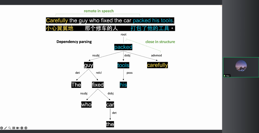 Chomsky回答道:“我覺得語言最深刻的特性叫做structure dependence。”也就是結構依賴。他通過一句話“The guy who fixed the car carefully packed his tools”來進行解釋。在這句話中,里面標黃的副詞‘carefully’,修飾的是‘packed’這個詞。兩個詞離得非常近,我們在整合句子意思時,會把兩個詞整合在一起,理解為“小心翼翼地打包”。