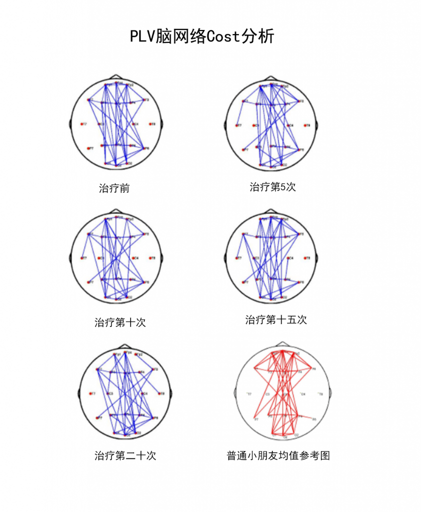 分析:PLV網(wǎng)絡(luò)表現(xiàn)各個(gè)腦區(qū)之間的信息交流,兩個(gè)節(jié)點(diǎn)之前有連線表示兩個(gè)節(jié)點(diǎn)對(duì)應(yīng)的腦區(qū)之間存在信息交流。該患者經(jīng)過20次治療,長連接明顯增多,短連接減少,表明大腦處理信息的能力增強(qiáng)。