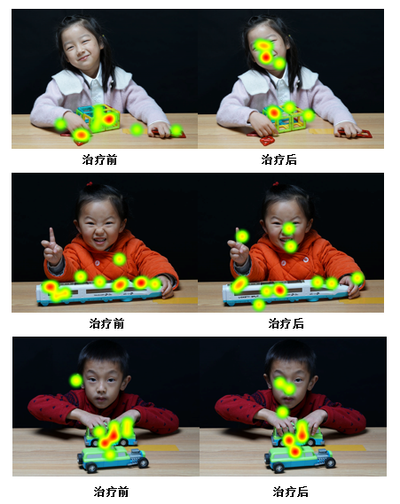 分析:熱點(diǎn)圖反映了受試者在治療前后對(duì)于不同刺激材料注視時(shí)長的變化情況(熱點(diǎn)圖的顏色越深表示對(duì)該區(qū)域注視時(shí)間越長,若某張圖無熱點(diǎn)則表明受試者在眼動(dòng)數(shù)據(jù)采集時(shí)沒有注視該圖片)。治療后受試者對(duì)包含玩具的社會(huì)性圖片中的人臉注視時(shí)長增加。