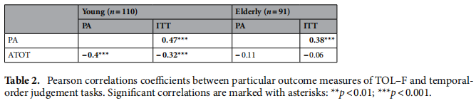 除此之外,兩個(gè)年齡組的兩項(xiàng)TOL-F指標(biāo)(PA和ITT)之間的相關(guān)性均顯著,說明PA值越高,預(yù)計(jì)劃階段持續(xù)時(shí)間越長。這表明測(cè)試表現(xiàn)出的內(nèi)在一致性與年齡無關(guān)。