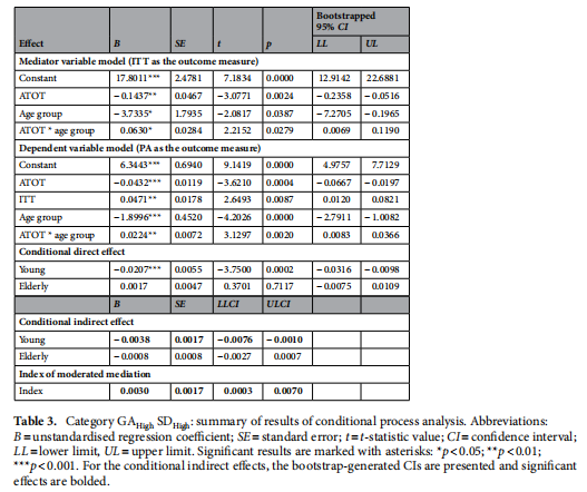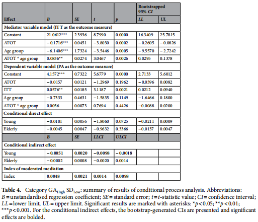 同樣的,年齡通過ITT調(diào)節(jié)了ATOT對(duì)PA的間接作用(IMM不含零:IMM=0.0030,CI=[0.0003, 0.0070])。在年輕組中具有顯著影響(B=-0.0038, CI=[-0.0076,-0.0010]),但在老年組中沒有顯著影響。