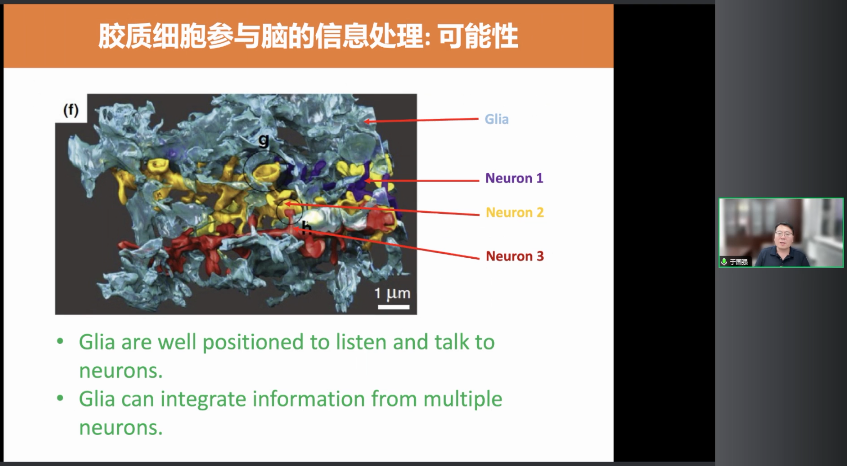 所以你可以想象膠質細胞它正好處在一個非常合適的位置上來監聽這些細胞,同時他有可能是能夠釋放信號來指導這些細胞。而且你可以看到圖中所示的一個膠質細胞可以覆蓋好多個神經元,所以膠質細胞有可能能夠整合多個神經元的信息。