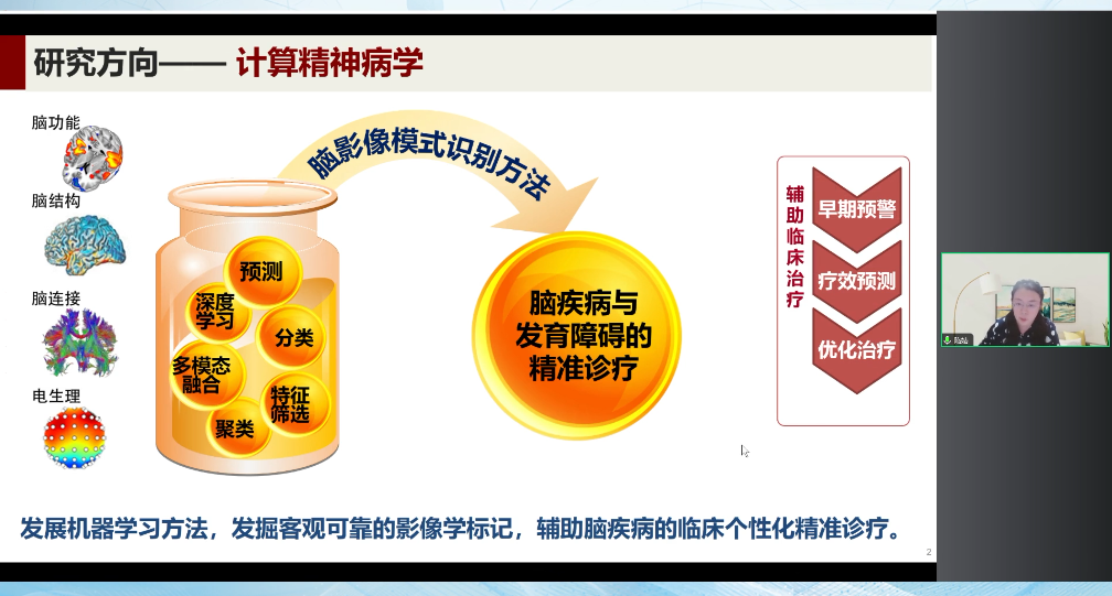 大家晚上好,很榮幸受到腦客中國的邀請,來給大家介紹一下我們團隊相關的工作。我來自北京師范大學認知神經(jīng)科學與學習國家重點實驗室,研究背景是計算精神病學,我們是希望能夠把一些AI、機器學習等腦影像模式識別方法應用到我們的多模態(tài)磁共振影像中,來實現(xiàn)精神疾病以及腦發(fā)育障礙的一些精準診療。我們希望通過客觀的影像學標記能夠幫助我們做到早期預警,療效預測和相關的優(yōu)化治療。