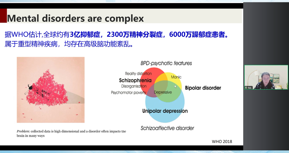 我本人首先是信息工科的背景,非常希望能夠把我們先進的計算學習技術應用到精神疾病的客觀診斷上來。根據(jù)國際健康組織WHO統(tǒng)計顯示,全球目前是約有3億的抑郁癥,2300萬精神分裂癥,以及6000萬的躁郁癥患者。這些重型精神疾病患者都存在高級的腦功能紊亂,同時在臨床表征上會非常的接近,這也給臨床依據(jù)癥狀來進行的診斷帶來了相當大的挑戰(zhàn)。