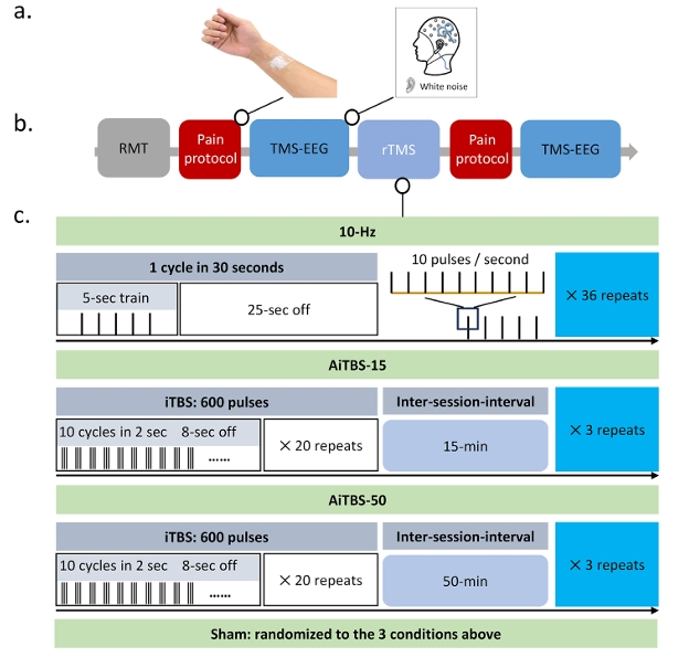 受試者分別在四天內接受了不同治療,包括10Hz-rTMS,AiTBS-15 (3 iTBS,每個部分間隔15分鐘),AiTBS-50 (3 iTBS,每個部分間隔50分鐘)以及假刺激。這四種治療均包含1800脈沖,但是治療持續時長不同,比如10-Hz rTMS為18分鐘, AiTBS-15為40分鐘(包含間歇時間30分鐘),AiTBS-50為110分鐘(包含間歇時間100分鐘)。