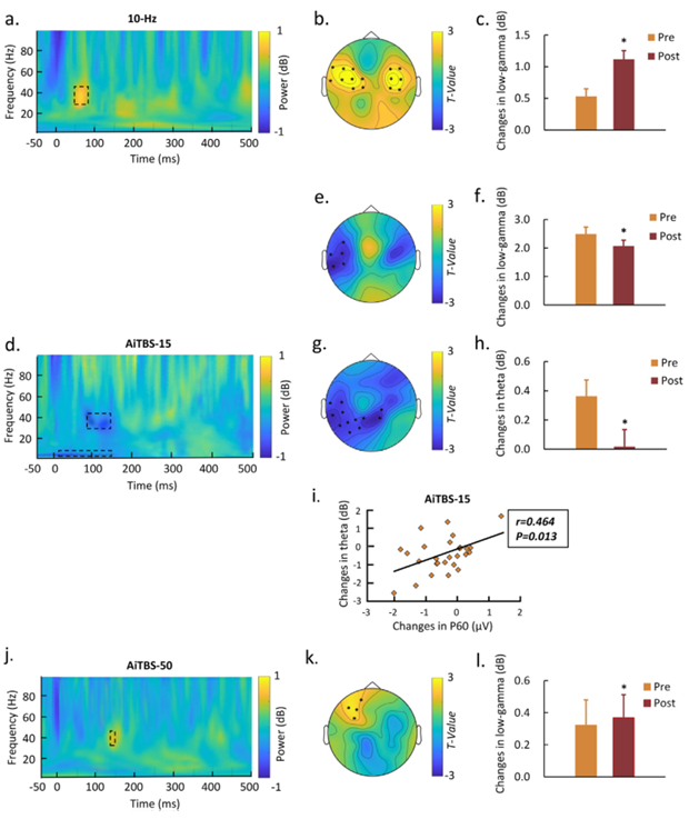 與10-Hz或AiTBS-15相比,AiTBS-50在刺激前后對TEP沒有誘導顯著變化(見圖2e和f)。然而,時頻分析揭示了左側額中央區域低gamma功率的顯著增加(見圖3i-k)。這一發現表明,AiTBS-50后皮層興奮性增加,這種效應與10-Hz rTMS相似。