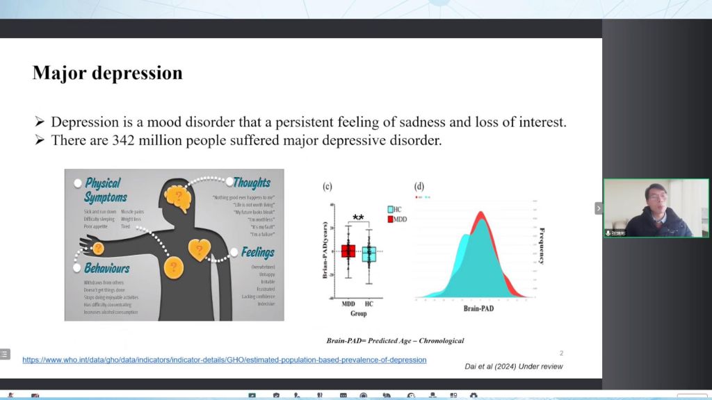 目前來說,它已經(jīng)影響了全球3.42億人。它有不同的癥狀表現(xiàn),包括軀體上的,行為上的,思維上的以及身體感受。我們自己和前人研究發(fā)現(xiàn)抑郁癥個(gè)體,他們大腦年齡其實(shí)相比正常人都是更老的。