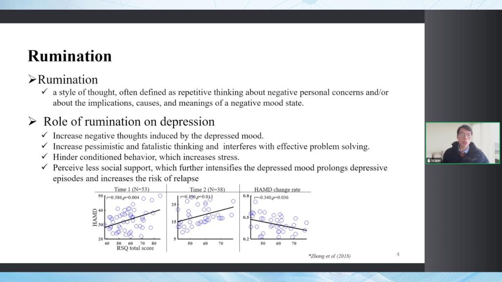 從時(shí)間的角度進(jìn)行分析,當(dāng)更注重的是對(duì)過去的過度思考,我們叫反芻思維;指向當(dāng)下的,就是感覺生活沒有意義,出現(xiàn)快感缺失;以及指向未來的興趣減退。 在這個(gè)框架下想進(jìn)一步去結(jié)合我自己感興趣的認(rèn)知控制方面來去做,采用的技術(shù)就是主持人在前面提到的腦成像和計(jì)算建模來充分解構(gòu)我們這樣的抑郁癥狀。