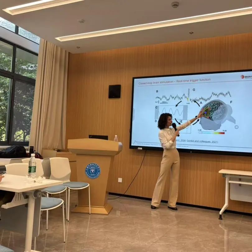 本次研討會邀請到Brain Products科學顧問Dr. Sara Pizzamiglio進行TMS-EEG閉環刺激相關分享。會上,首先由王繼軍教授進行開場致詞,對瀚翔腦科學與Brain Products 公司的大力支持表示衷心感謝,并對與會的各位老師和醫生表示熱烈歡迎。接著,由Dr. Sara向各位醫生、老師、同學,分享了TMS-EEG技術的最新研究成果,還通過實操演示,讓與會者直觀感受到最新的專業閉環刺激套件:Turbolink與bossDevice精準的數據傳輸速度與超高的腦電數據處理預測功能,體現了該技術在實際應用中的強大潛力。