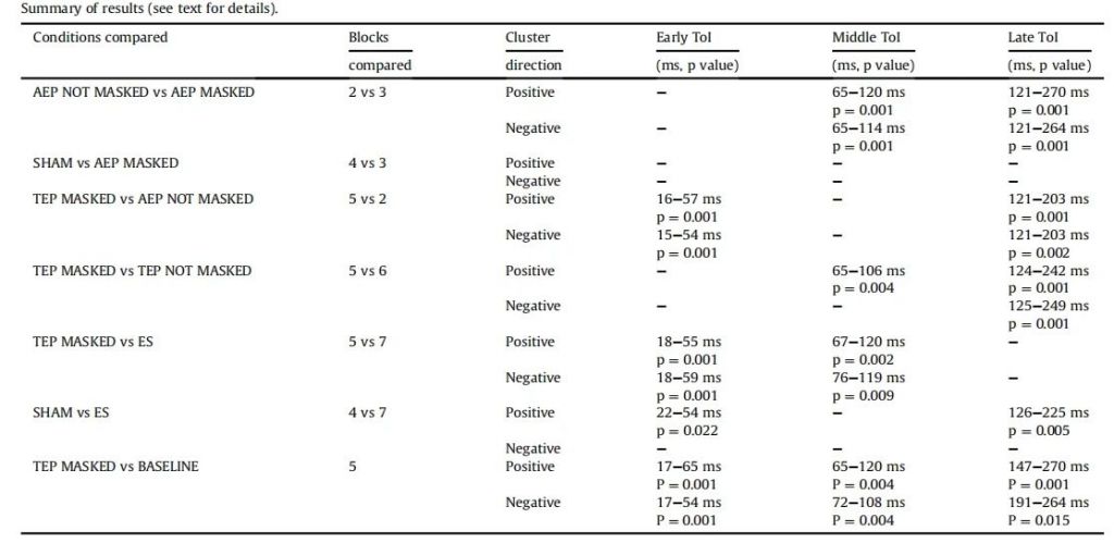 1. block 1:使用標準線圈,放置在一個5厘米厚的紙板圓柱上,直接刺激頭皮,但沒有噪聲掩蔽(TMS-AEP NOT MASKED)。這一條件與block 2的反應相似,因此未用于統(tǒng)計比較。