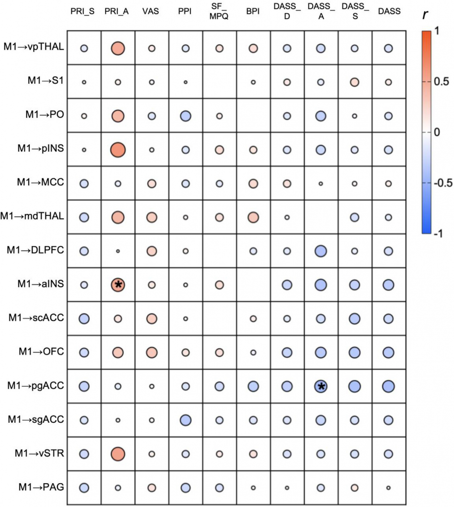 通過皮爾遜相關性分析發現M1至前島葉(aINS)的電流傳播強度與情感疼痛體驗量表之間存在顯著的正相關關系。這意味著電流傳播的增強與患者情感疼痛體驗的加重密切相關,提示了前島葉在神經病理性疼痛情感成分中的重要作用。