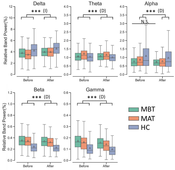 EEG 數據預處理后,計算相對頻帶功率(RBP):將 1–44 Hz 的絕對功率(ABP)按頻段比例標準化,得到五個子頻段的 RBP:Delta(1–4 Hz)、Theta(4–8 Hz)、Alpha(8–13 Hz)、Beta(13–30 Hz)、Gamma(30–44 Hz)。每個通道的 15 個試次 RBP 取平均,同一腦區的通道平均值進一步得到腦區 RBP,全腦 31 通道平均值則用于整體指標。此外,為分析時間動態響應,將最后階段 epoch 重定義為 3.5 秒,計算刺激前、刺激中(分兩階段)及刺激后的 RBP 變化。