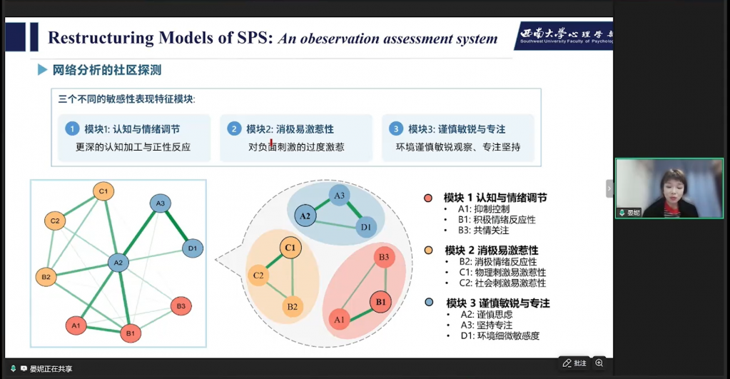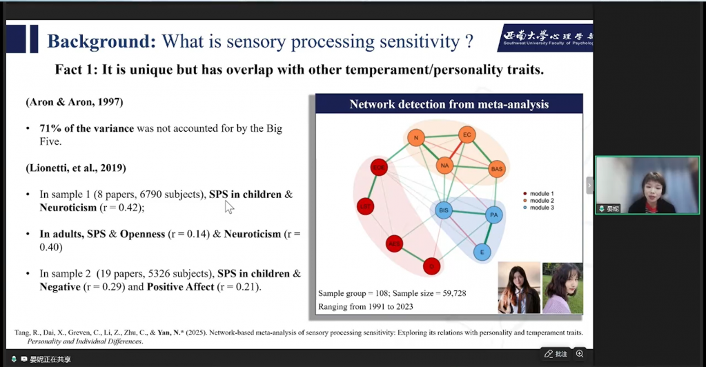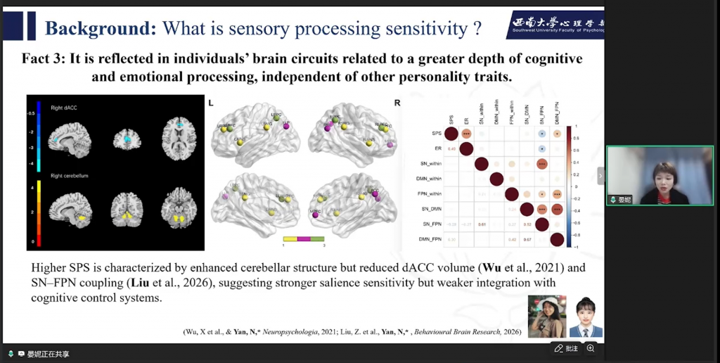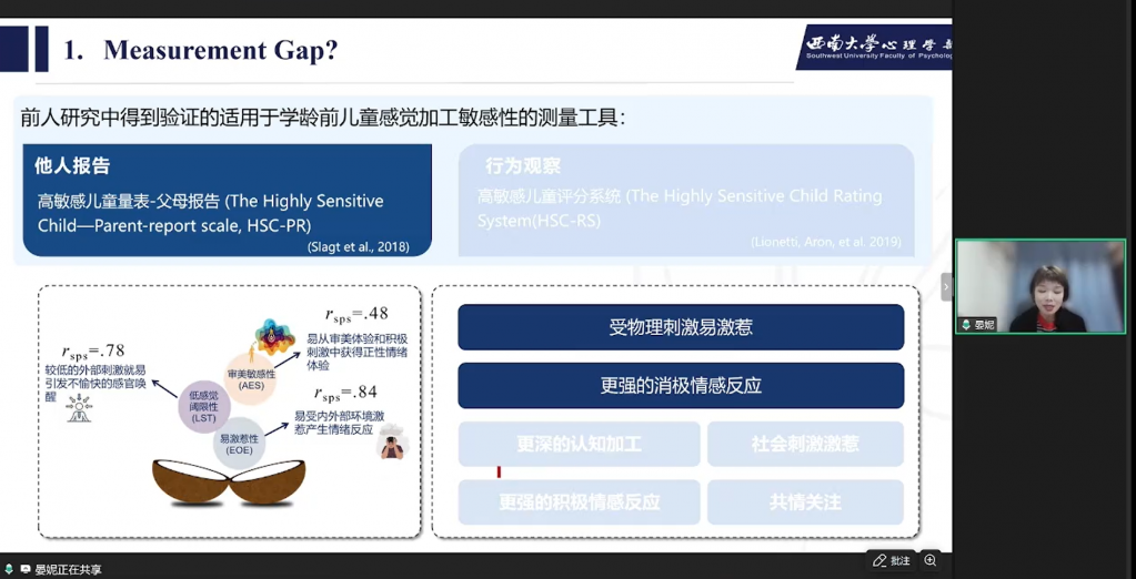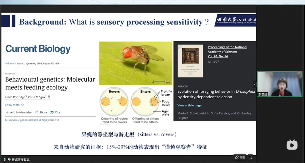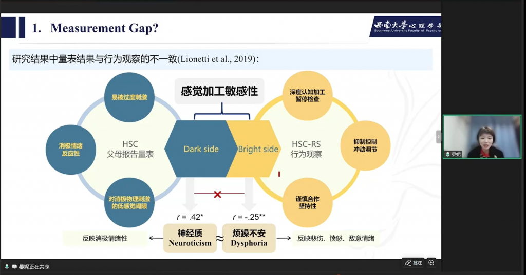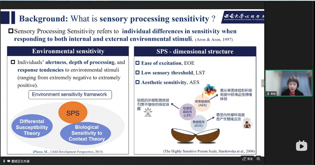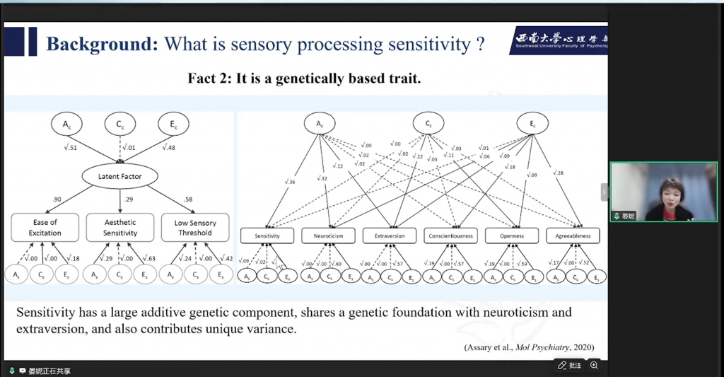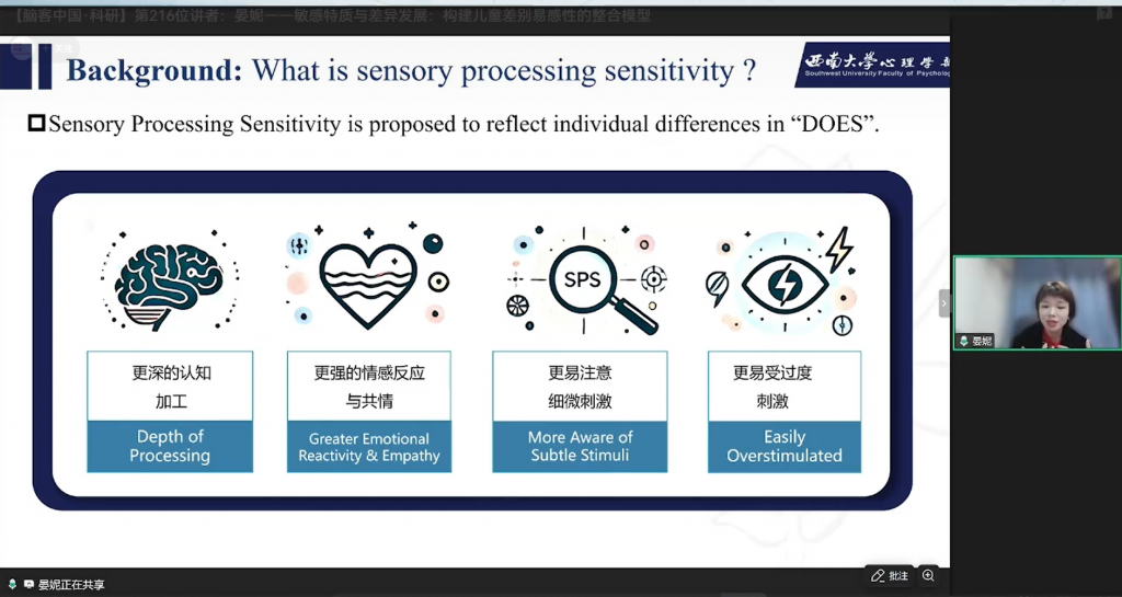 3月12日晚,西南大學心理學部晏妮教授做客腦客中國科研直播間,進行了以“敏感特質與差異發展:構建兒童差別易感性的整合模型”為主題的專業分享。晏妮教授及其團隊近年來聚焦兒童感覺加工敏感性這一核心特質,從核心概念、研究疑問、研究發現三個板塊,探討了兒童在面對家庭環境影響時所表現出的差別易感性機制,并結合實證研究成果展開系統闡述,以下為本次直播的主要內容回顧: