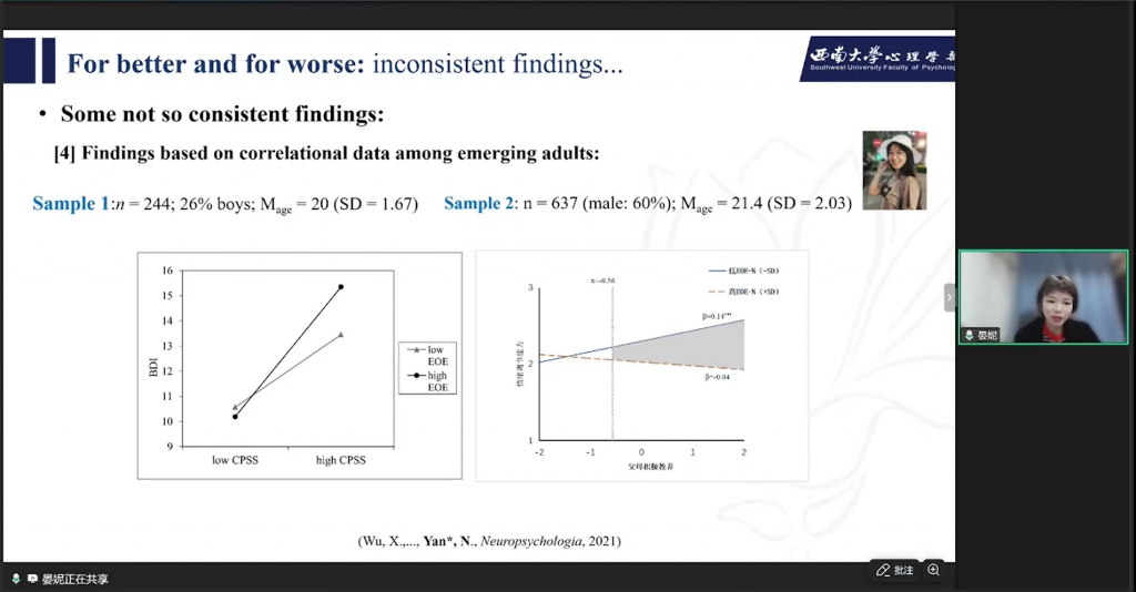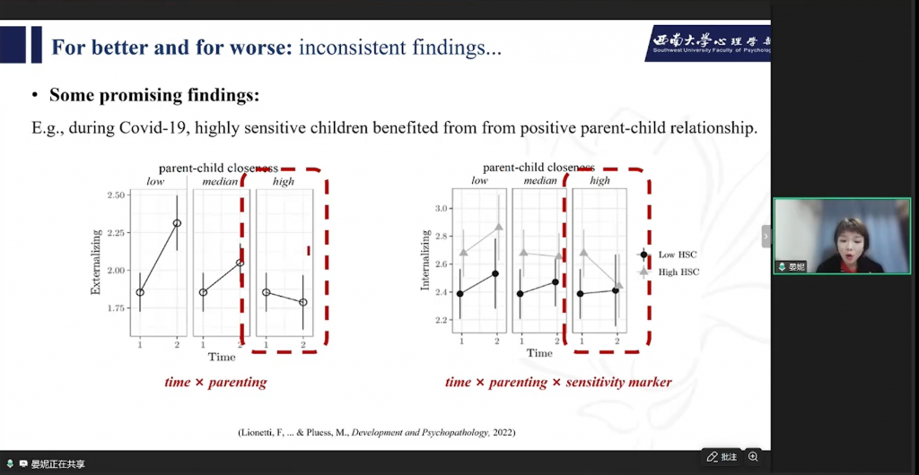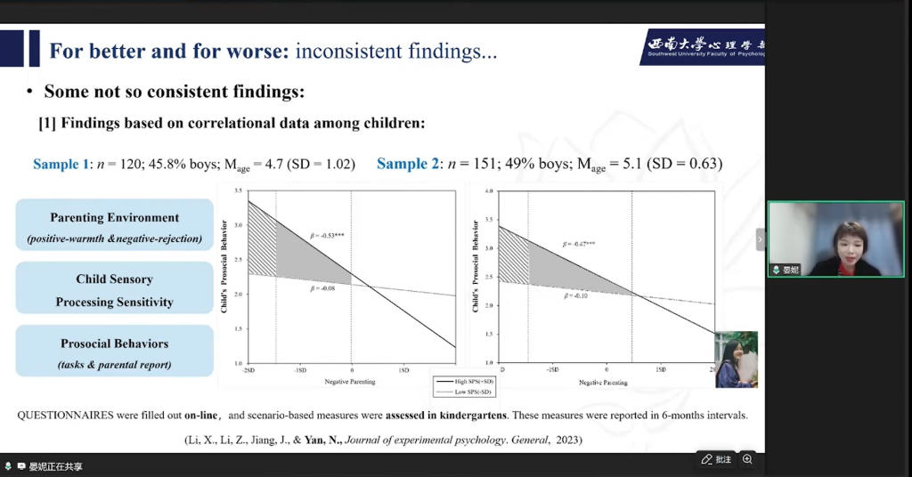 但晏妮教授實驗室及其他相關研究卻出現不一致結果:3-6歲幼兒對家庭積極教養行為無顯著交互反應,僅對消極教養更敏感;觀看負性反饋視頻后高敏感孩子親社會意圖和積極情緒顯著下降,觀看積極反饋視頻則無明顯積極反應;幼小銜接階段高敏感孩子未表現出更強易感性,大學生群體僅對消極環境/負性事件易感,對積極因素無明顯響應。