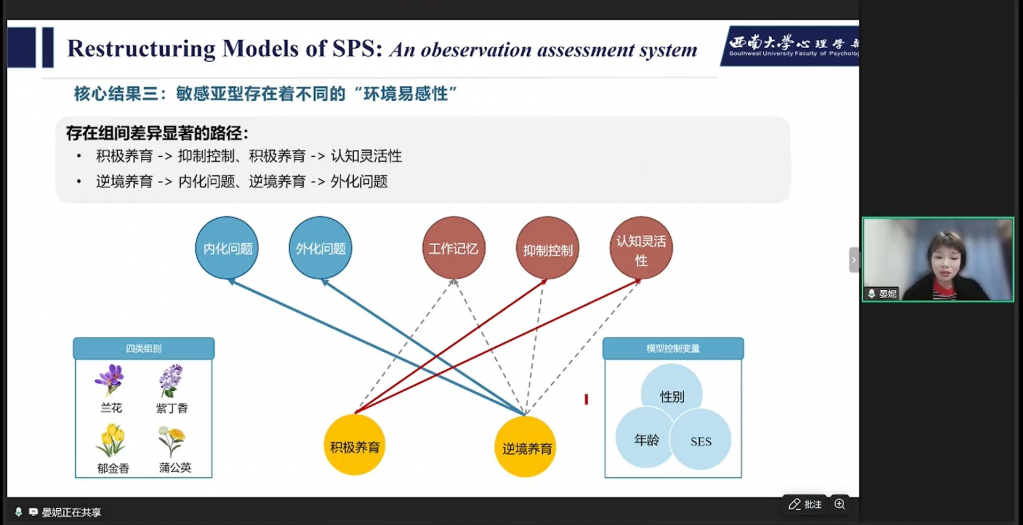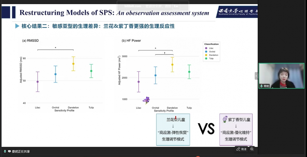 基于新工具研究,得出核心結果:兩類高敏感亞型——高敏感蘭花vs高敏感紫丁香,表現出對物理刺激和社會刺激的易激惹性不一樣;敏感亞型的生理差異,紫丁香型生理反應調節性最差,表現出比較“僵化”的生理調節模式;敏感亞型存在不同的“環境易感性”,在內外化問題、抑制控制、認知靈活性等路徑存在顯著的組間差異。
