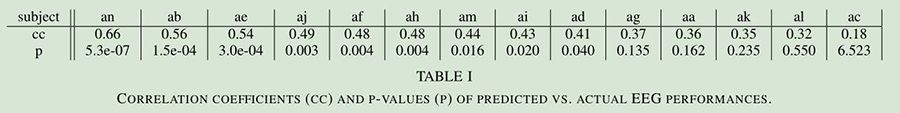 近紅外型號(hào)被劃分為多個(gè)片段,每個(gè)2S,5個(gè)trial分別為2 4 6 8 10,噪音通道被做刪除處理。使用線性回歸分析近紅外數(shù)據(jù)在腦電數(shù)據(jù)上的性能預(yù)測(cè)。如圖3所示。最上方薄黑色的區(qū)域代表trial,分別為左手和右手運(yùn)動(dòng)想象提示時(shí)間。每次5個(gè),重復(fù)60次,每5個(gè)都遺漏一個(gè)不同的trial,從而導(dǎo)致每個(gè)trial的性能預(yù)測(cè)。使用這種預(yù)測(cè)來計(jì)算相關(guān)系數(shù)和回歸系數(shù)。針做虛無假設(shè)下的相應(yīng)的P值檢驗(yàn),并使用Bonferroni矯正。