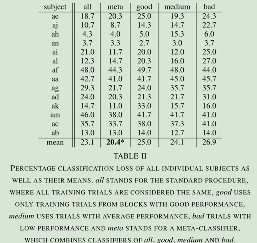 基于近紅外的數(shù)據(jù)預(yù)測(cè),腦電數(shù)據(jù)分為三個(gè)類別,較好性能,一般性能和較差性能,三個(gè)類別都包括100個(gè)trials,分類原則包括了修正的濾波數(shù),空間濾波和線性分類。第二步我們做了個(gè)元分類,包括四種識(shí)別分類。