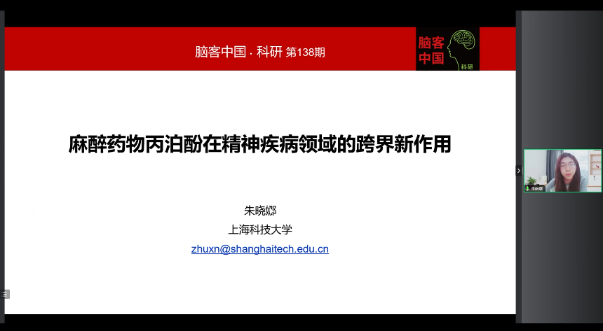 2024年3月27日晚20點,上海科技大學生命科學與技術學院朱曉娜副研究員作為腦客中國科研第138位講者為大家帶來主題為《麻醉藥物丙泊酚在精神疾病領域的跨界新作用》的報告。以下內容節選自直播視頻: