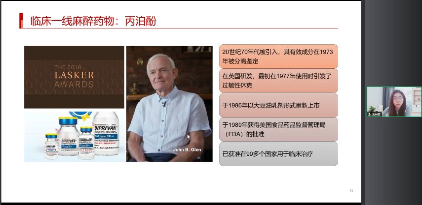 2018年美國拉斯克獎將臨床醫學獎頒給了丙泊酚的研發者約翰格倫,足以證明丙泊酚的重要性。丙泊酚的活性成分其實在1973年就被分離出來了,中間經歷了很長時間的一個溶劑的改良,最終在1989年獲得FDA的一個批準。